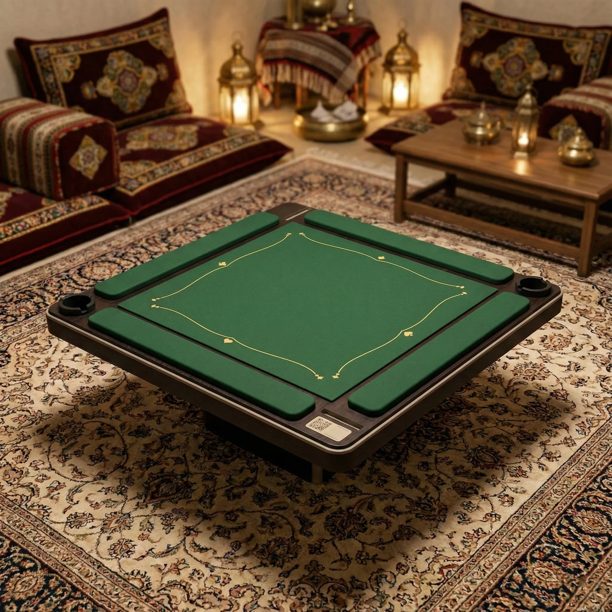طاولة الجنجفة الفخمة الجديدة مصنوعة من الخشب والمبطنة بالإسفنج مخصصة للعب الجنجفة، طاولة فخمة بها فتحات لقواعد الهواتف وعدد 2 طفاية أو حامل أكواب وصوت للجرس، وأرجل قوية للطاولة يمكن رفعها وإنزالها لعدد 3 سم.